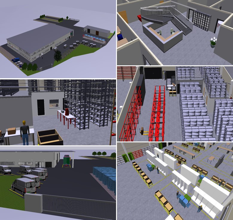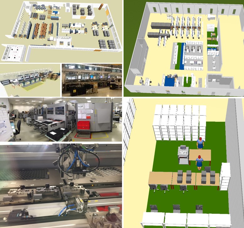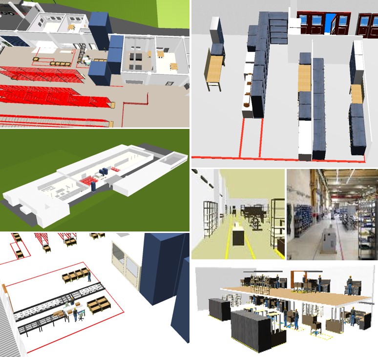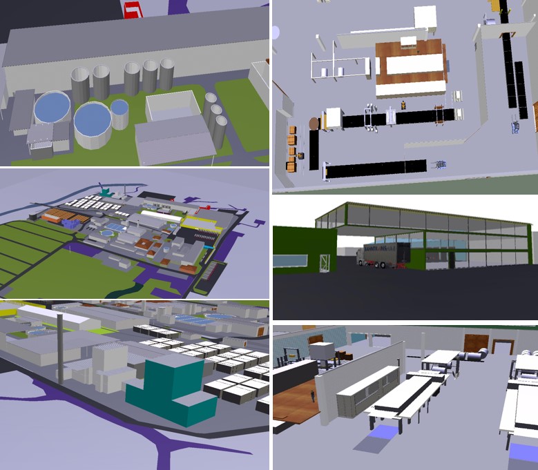 Druga uporaba 3D-načrtovanja v fazi podrobnega načrtovanja je simulacija tokov materiala, proizvodnih procesov in zaporedij gibanja. Te simulacije omogočajo preverjanje učinkovitosti načrtovanih procesov ter prepoznavanje in odpravljanje morebitnih ozkih grl ali neučinkovitosti še pred gradnjo tovarne.