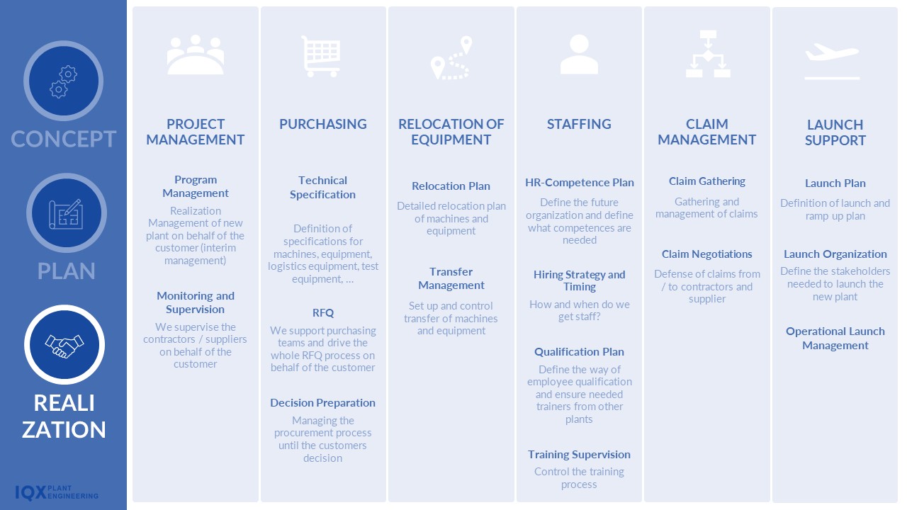 Napake, storjene med fazami načrtovanja in izvedbe, je kasneje zelo težko ali celo nemogoče popraviti. Podjetjem nudimo podporo od izbire lokacije do popolne realizacije njihovih obratov.