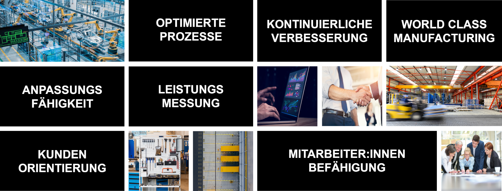 • Development of an efficient team organization • Development and qualification of a high-performing team leader pool • Learning to "see and eliminate" waste • "Agile leadership" • Introduction and strengthening of competency management as a human resource • Clear tasks, competencies, and responsibilities across all roles and employees