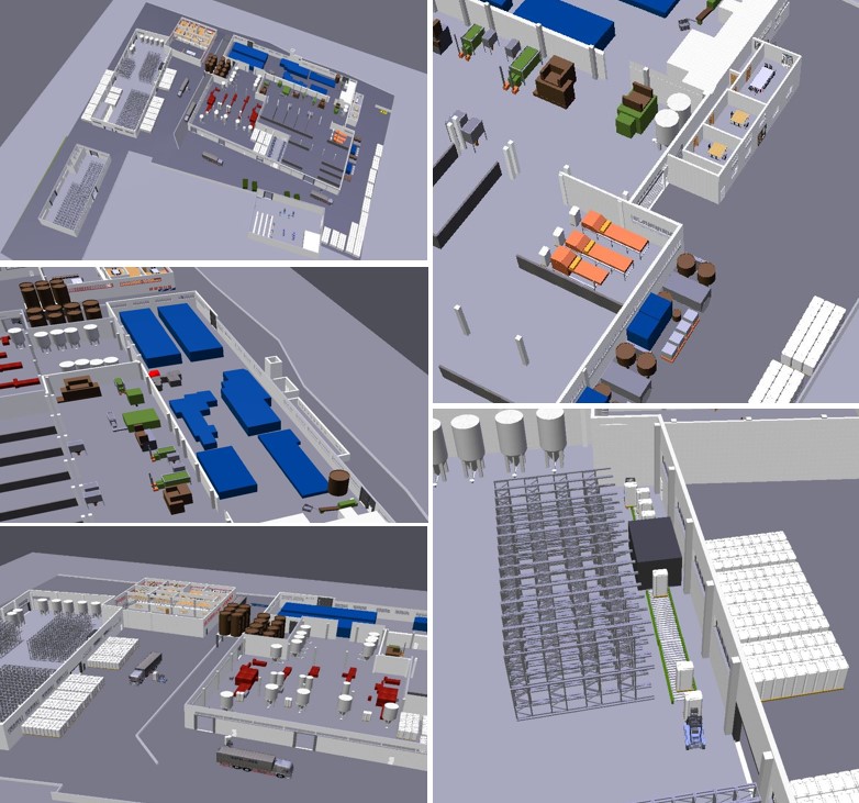 Druga uporaba 3D-načrtovanja v fazi podrobnega načrtovanja je simulacija tokov materiala, proizvodnih procesov in zaporedij gibanja. Te simulacije omogočajo preverjanje učinkovitosti načrtovanih procesov ter prepoznavanje in odpravljanje morebitnih ozkih grl ali neučinkovitosti še pred gradnjo tovarne.