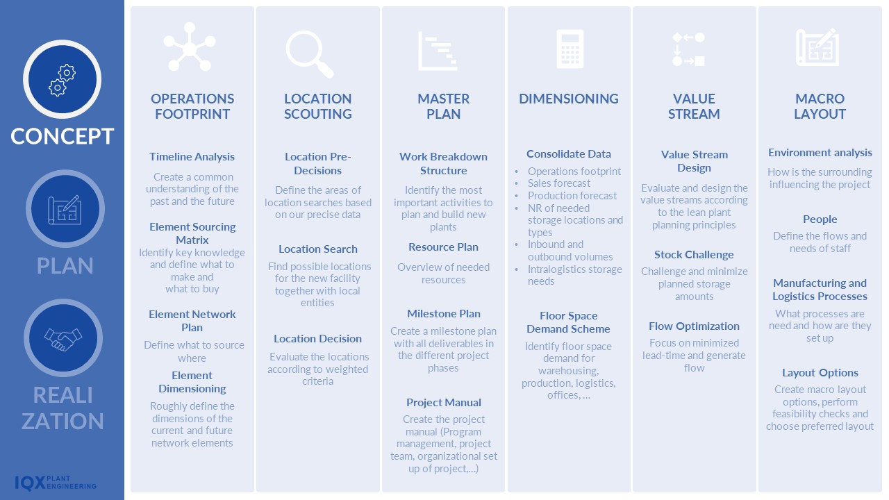 Napake, storjene med fazami načrtovanja in izvedbe, je kasneje zelo težko ali celo nemogoče popraviti. Podjetjem nudimo podporo od izbire lokacije do popolne realizacije njihovih obratov.